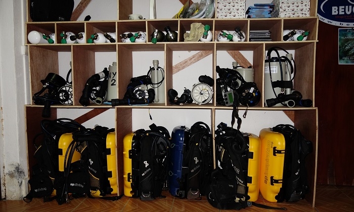 Possibilité de location d’équipement sur place : PMT, combinaisons intégrales et shorty en 3mm, ordinateurs de plongée, détendeurs avec embout octopus.