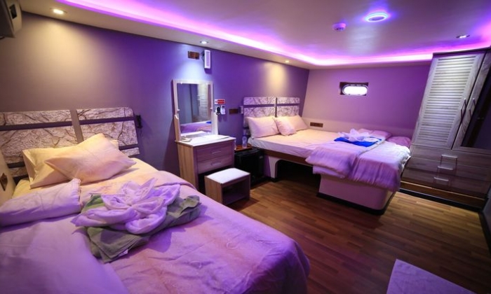 - Cabines: 13 cabines : 6 cabines Suites en pont supérieur avec balcon privatif, 2 Master Suite en pont médian et de 5 cabines doubles standards en pont inférieur, toutes équipées d’une douche et toilettes privatifs.