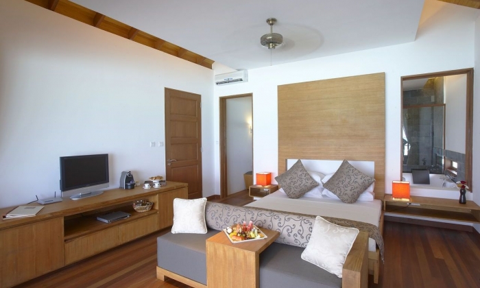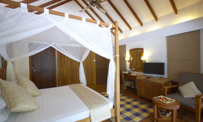 Beach Villa 44 Beach Villas individuelle - 65 m² Dispersées autour de l'île, face à la plage, les villas disposent de : Climatisation - Télévision à écran plat - Lecteur DVD - Téléphone direct - Internet sans fil - Sèche-cheveux - Thé / café en chambre - Mini-Bar - Terrasse en bois privée avec balancelle - Coffre-fort - Lit à baldaquin King ou Twin - Douche pluie en extérieure - chaises longues.