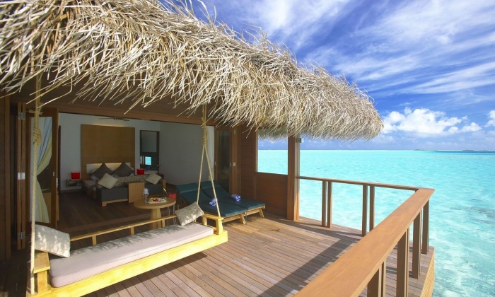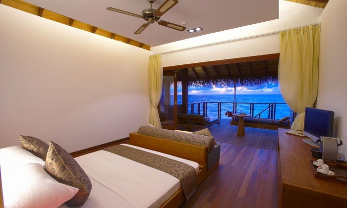 Water Villa 44 Water Villa (Villa sur pilotis) - 60 m² Construites sur pilotis dans le lagon, face à un lever ou un coucher de soleil, les chambres disposent de baies vitrées et offrent une vue spectaculaire sur l'océan. Elles sont équipées de : Climatisation - Télévision à écran plat - Lecteur DVD - Téléphone direct - Internet sans fil - Sèche-cheveux - Thé / café en chambre - Mini-Bar - Grand patio avec des escaliers menant dans la mer - Balancelle - Coffre-fort - Lit King ou Twin - Baignoire et douche à l'italienne séparée - chaises longues.