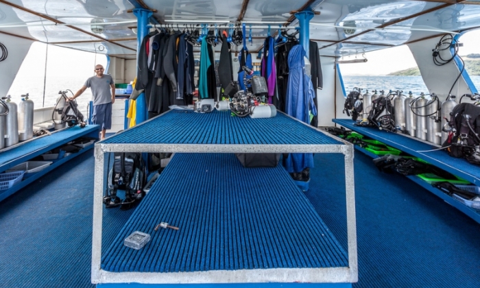La plongée sous-marine étant le but premier du M/V Bilikiki, on ne s'étonne pas d'apprendre qu'il offre tout le confort nécessaire pour la pratique de votre discipline favorite. Le dive deck est très spacieux, il laisse beaucoup de place pour s'équiper. Les vidéastes et les photographes disposent même d'un espace dédié pour leur matériel, ainsi qu'un bac de rinçage spécifique. Les plongées se font depuis les "tinnies", des speed boat qui permettent d'accéder rapidement au plus près des spots et de s'immerger en bascule arrière. Les remontées sont aisées, la plupart des immersions se font en dérivante, et on grimpe sur les tinnies par une échelle. Si le croisiériste annonce un forfait de plongées illimitées, notez que 5 immersions sont organisées chaque jour. Pour y participer en toute sécurité, le Nitrox est disponible à bord. Si vous souhaitez voyager léger, sachez qu'il est possible de louer de l'équipement à bord (nous vous recommandons de réserver et de nous indiquer votre taille avant le départ)