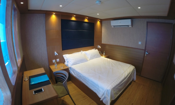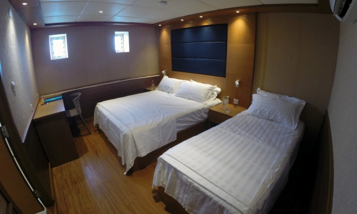 Type de cabines : 4 cabines grand lit / 8 cabines double avec : mini-bar, salle de bain, a/c reglage individuel, serviettes et peignoires.