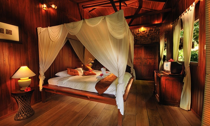 La première partie de votre séjour vous emmène au coeur du parc national de Bunaken, sur une longue plage de sable blanc, offrant une vue spectaculaire sur le volcan Tua. Là, s'étend le Siladen resort & spa, un boutique hotel de plongeurs qui cumule les awards et les atouts. Vous y trouverez une piscine d'eau de mer, un bar plage, ainsi que votre centre de plongée, directement implanté à la structure. Dans ce petit coin de paradis, nous vous proposons de loger dans l'une des 10 villas vue jardin que compte le resort. Ces batisses de bois et de pierres naturelles sont nichées dans un coin paisible, enveloppées par la végétation tropicale, à quelques pas de la mer. Leur dimension confortable, 48m², est amplement suffisante pour accueillir une terrasse, une salle d'eau à ciel ouvert, et une vaste chambre. Parmi les services sur lesquels vous pourrez compter : l'air conditionné, un coffre fort, un mini bar, la télévision par satellite, thé et café à discrétion, Wifi...