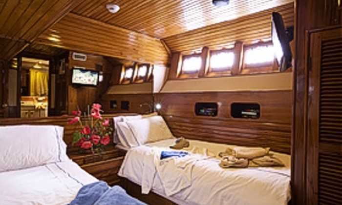 A bord de ces motor yachts "d'expédition", on trouve dans les communs un carré composé d'un salon (avec accès internet!) et d'une salle à manger, un sundeck avec bar et barbecue. Le service de restauration est varié. Il comprend des plats cuisinés à bord à base de produits frais locaux, accompagnés de boissons incluses dans votre forfait (eau, thé, café, jus de fruits, sodas, sélection de bières et de vins). Votre bateau comporte 8 cabines. La moitié sont des «Master Suites» doubles ou twin, situées sur le pont supérieur. Les 4 autres sont des "deluxe" avec une literie twin. Toutes les cabines du bateau disposent de l'air conditionné, d'une télévision à écran plat avec lecteur de DVD, d'un lecteur CD, d'un coffre fort et d'une salle d'eau WC privative avec sèche cheveux. Prises 110v, prévoir un adaptateur.