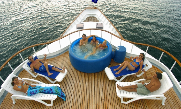 Les navires de croisière de la flotte Aggressor sont tous de grand standing. On trouve les bateaux de ce croisiériste Américain sur les plus beaux spots du monde, il est donc tout à fait logique de les voir sillonner les eaux de l'archipel des Galapagos.