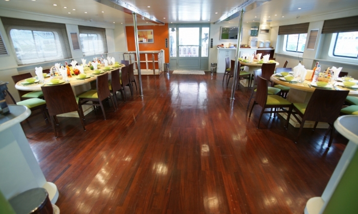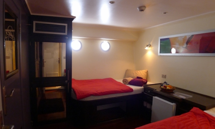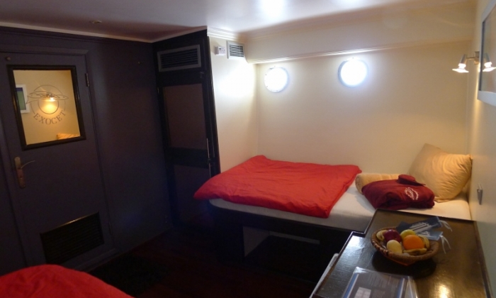 - 12 cabines twin climatisées avec lits 100 x 200, salle d'eau, nombreux rangements, grands hublots, frigo rempli de boissons fraîches, peignoir et linge de toilette. NB : Certaines cabines disposent d'un lit plus large, pour les couples